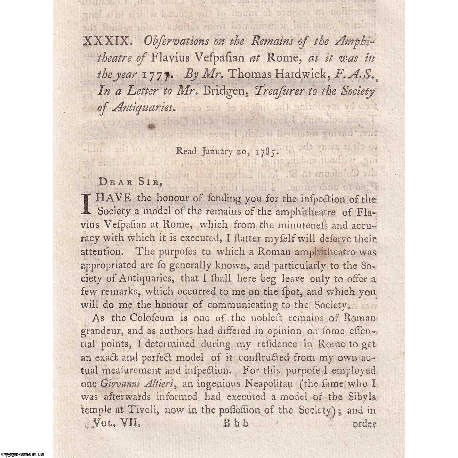 Title:Observations on the Remains of the Amphitheatre of Flavius Vespasian at Rome, as it was in the year 1777. An article printed in 1785, written by Mr. Thomas Hardwick, F.A.S. : 5 pages