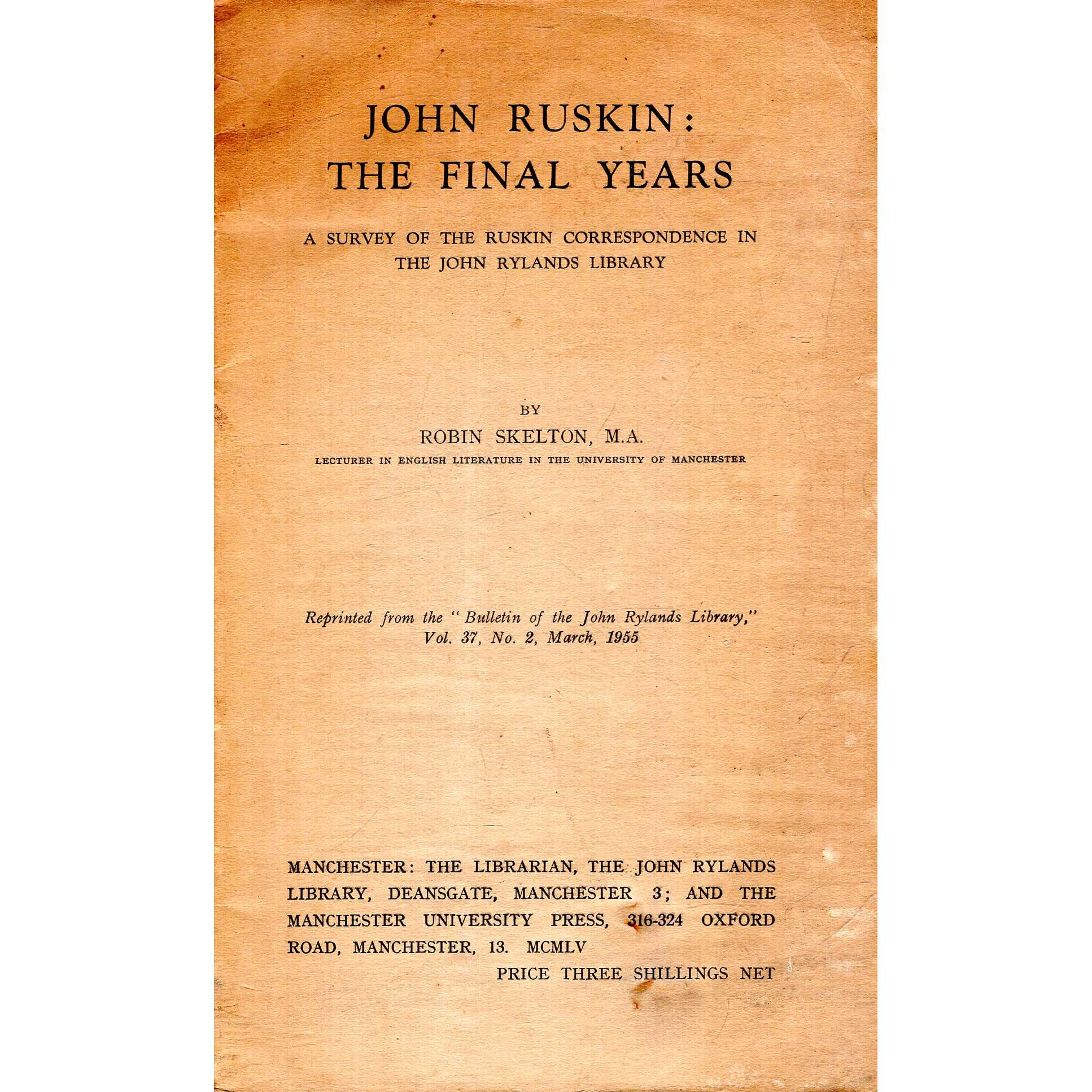 Title:John Ruskin : The Final Years, a survey of the Ruskin correspondence in the John Rylands Library